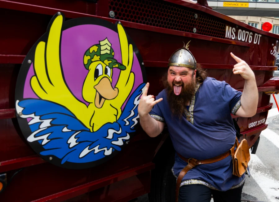 Bjorn The Bezerker came to our shores with an appetite for destruction, but once he laid eyes upon our fair city, he traded his sturdy Viking boat for a colorful Duck, and his pillaging sword for a library card. Set sail with the Bezerker and let him showcase the spoils of his studies!