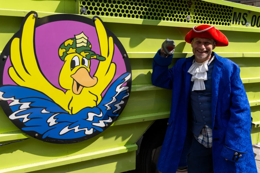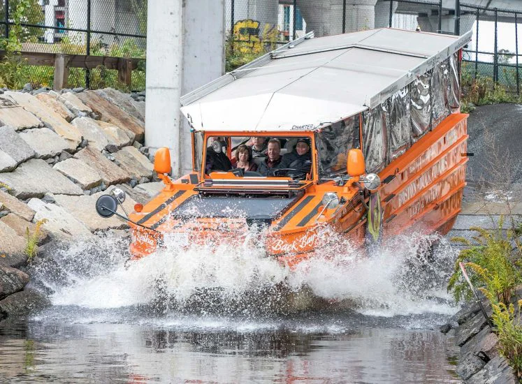 Welcome aboard. We will be exploring Boston both by land and sea aboard the perfect vehicle to do so, the DUKW.