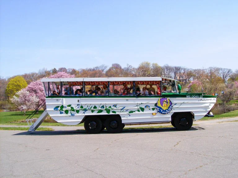Alex has been considered the fleets prettiest DUCK. She has large blue morning glories spanning the length if her white body. Her top half is painted green. She was named after the Arborway section of Boston located in Jamaica Plain. The Arborway was a piece of the famous “Emerald Necklace” a 40-mile ring of parks that encircles the city of Boston. This park system was created by the famous landscape architect, Frederick Law Olmstead, who also created Central Park in New York City. Arborway Alex was Boston Duck Tours first bio-diesel DUCK. We thought it would be fitting to give this vehicle a “green” theme given the momentous step the company had taken towards going green. Alex was christened in conjunction with the Emerald Necklace Conservancy in 2008 at the Arnold Arboretum.
