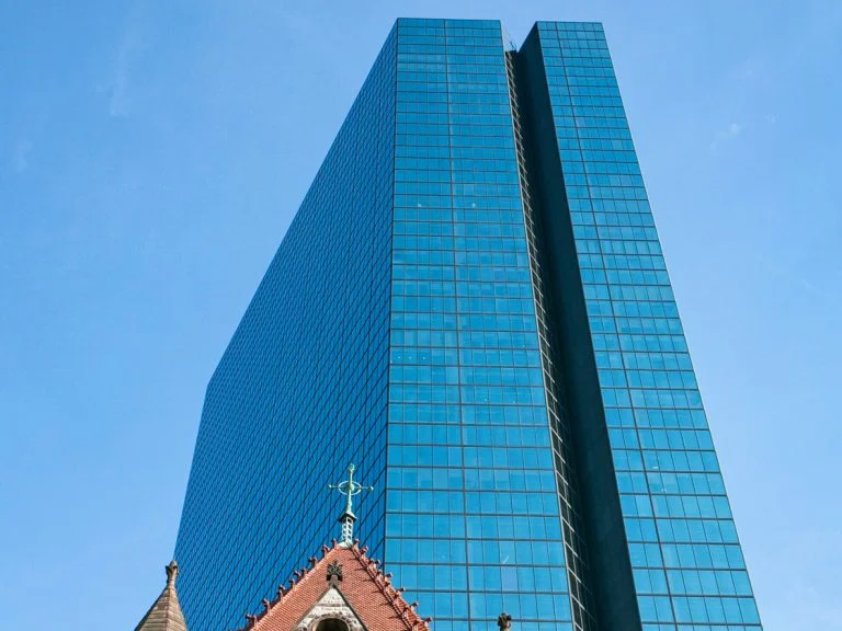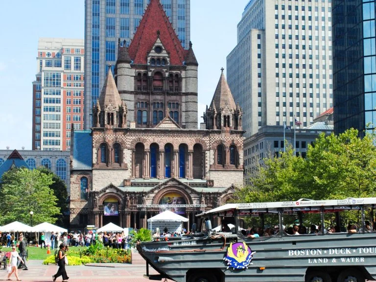 This is New England’s tallest building. It is 60 stories tall. There is no public observatory at the top of the building. Formerly referred to as The Hancock Tower, it completed in 1976. The principle architect was Henry Cobb, in partnership with I.M. Pei. The Tower has 10,346 panes of reflective glass. Guests like to take a picture of the Duck reflected in the glass on the St. James side of the building. The building was designed to reflect the old architecture of Copley Square.
