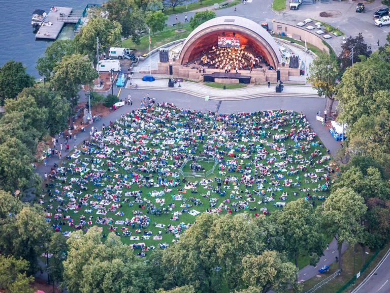 The Hatch Shell was built on the Esplanade in 1940 and was funded by a trust fund established by Maria Hatch as a memorial to her brother. It is used in the summer for concerts, movies, and civic events. Every year, on the Fourth of July, the Boston Pops Orchestra performs in the Hatch Shell. The concert is followed by a spectacular fireworks display. Arthur Fielder introduced outdoor concerts on the Esplanade in 1929.