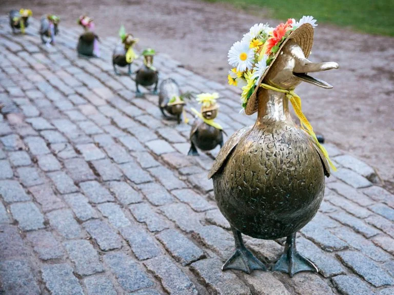 The statues are Mrs. Mallard and her eight ducklings. They were made famous by Robert McCloskey’s popular children’s book, Make Way For Ducklings. The book was published in 1941. Make Way For Ducklings is so popular in Boston; the Boston Public Library has over 150 copies of the book and is the official Children’s book of Massachusetts.