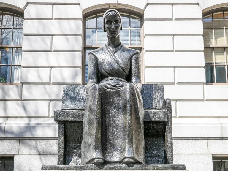 The statue of Mary Dyer was erected in 1959. It commemorates Mary Dyer, one of four Quakers hanged by the Puritans. The Puritans came here looking for religious freedom, but they would not tolerate other religions in the Colony of Massachusetts. Mary Dyer’s only crime was that she was a Quaker.