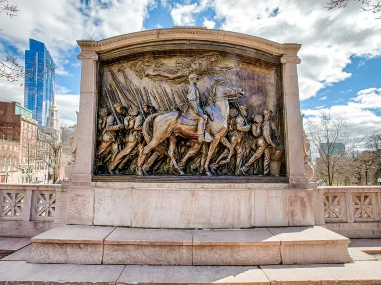 This monument was dedicated to Colonel Robert Gould Shaw, commanding officer of the Massachusetts 54th Volunteer Regiment. The 54th was the first all-black volunteer Union regiment organized in the North during the Civil War. Shortly after the Emancipation Proclamation of January 1863, Governor John Andrew sought permission from Washington, to recruit the 54th Regiment. Many of the volunteers were from Boston.